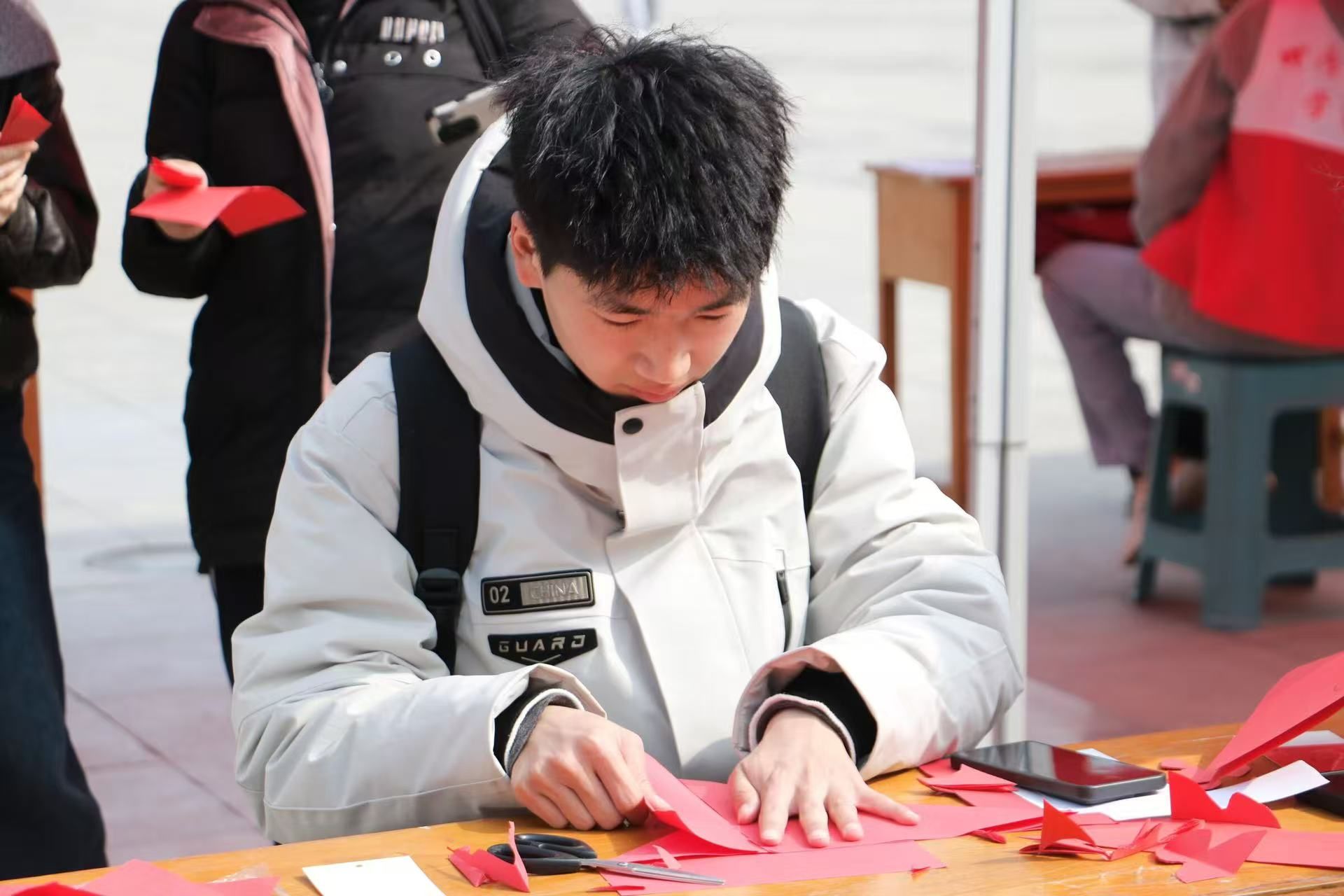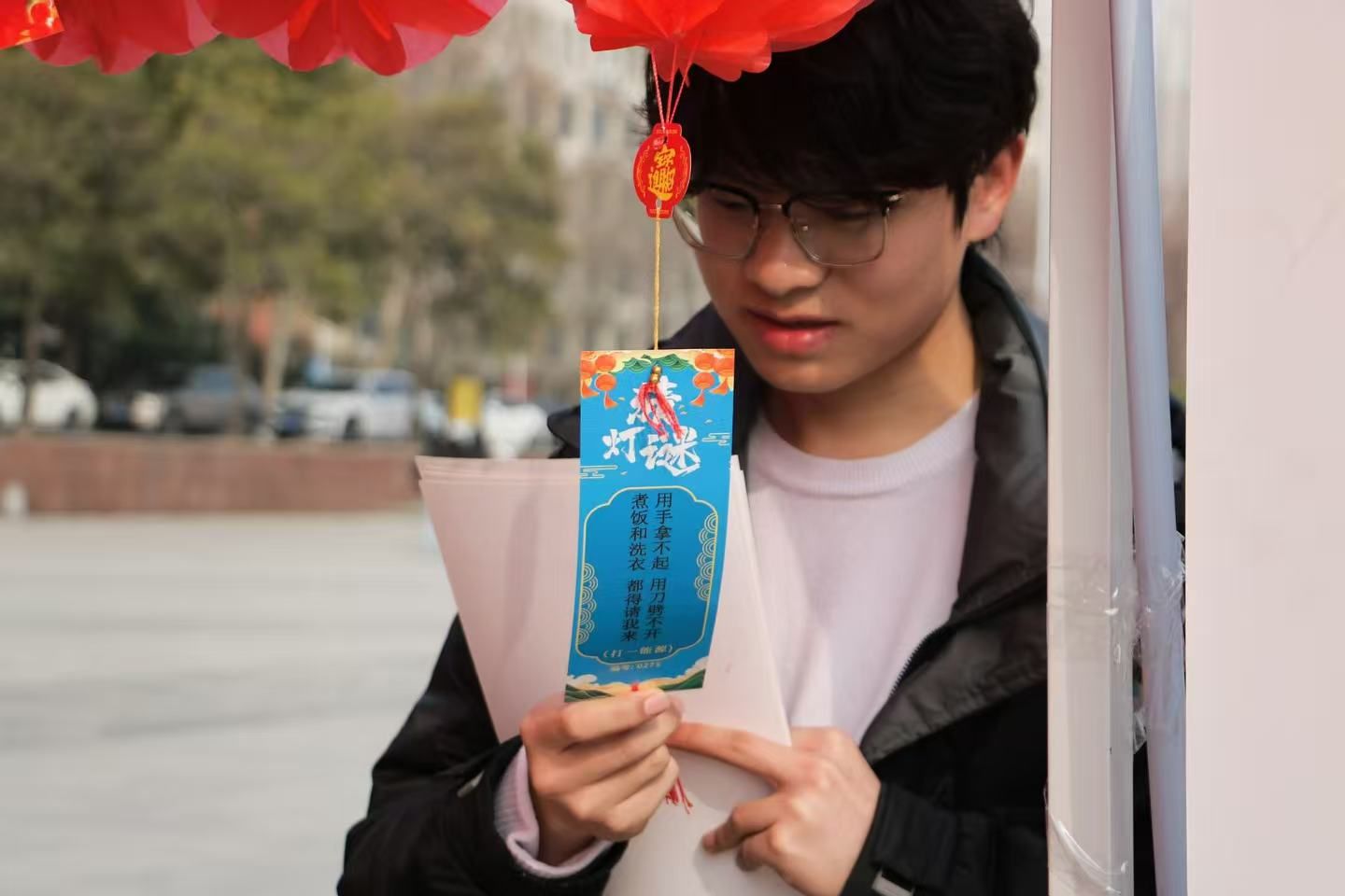 千年灯火映照团圆,一城欢喜共庆元宵。活动现场氛围感拉满,校团委书记柴高洁、副书记卜艳萍来到活动现场,与大家一同欢庆元宵佳节、共享游园之乐。在祈福牌区域,同学们提笔写下新年期许与元宵祝福,将美好心愿亲手夹于许愿绳上;投壶区里,大家全神贯注投箭,体验传统雅趣,欢呼与笑语交织不断;筷子夹“元宵”区中,众人手持长筷,挑战夹取光滑的乒乓球,计时比拼间满是欢声笑语;猜灯谜区人气火爆,同学们或独自思索或结伴解谜,在趣味问答中收获知识与喜悦;剪花灯区则洋溢着文艺气息,同学们跟随指导,巧手裁剪,让“春”“福”等花灯纹样跃然纸上,感受传统手工之趣。